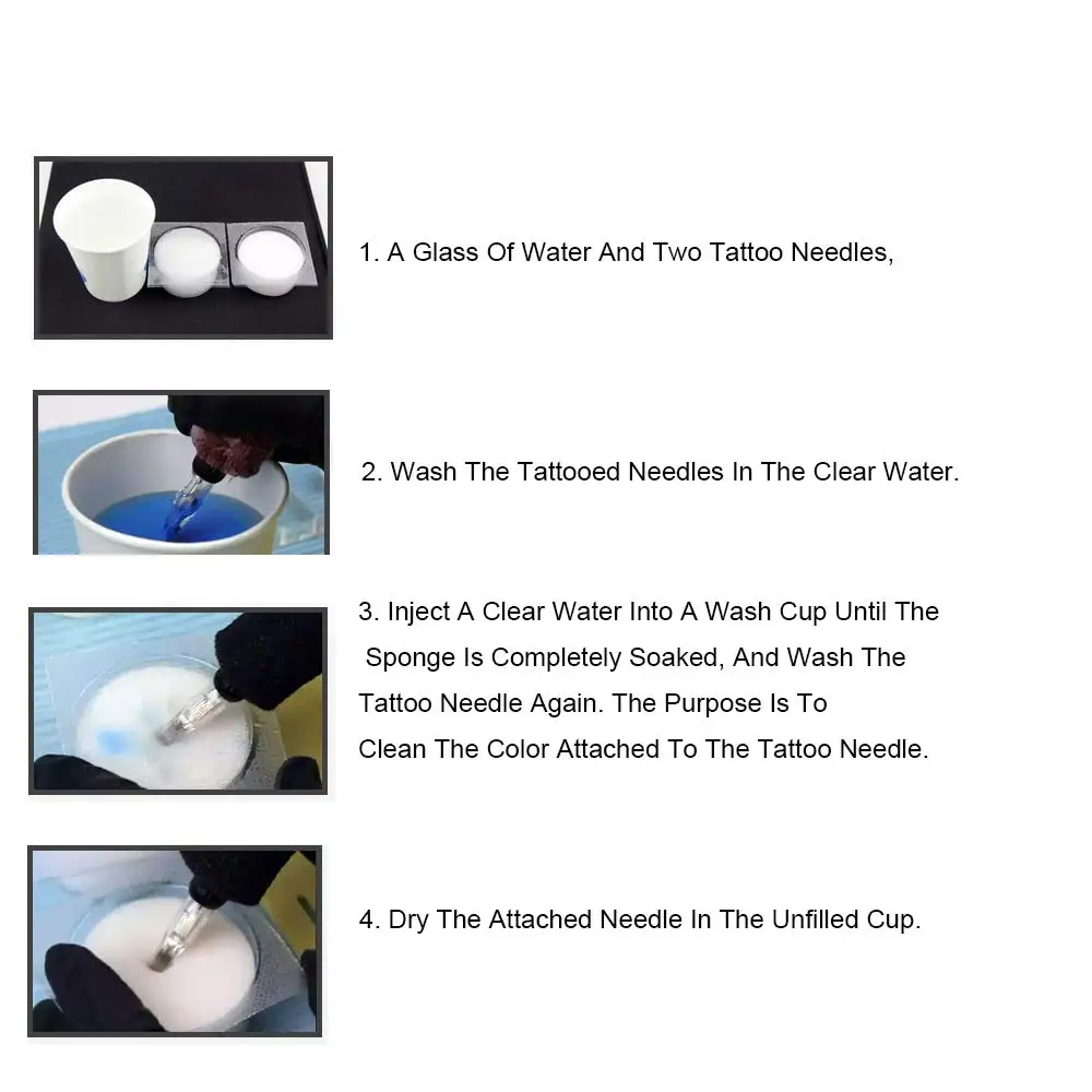 3. Inject A clear water into A wash cup until the sponge is completed soaked, and wash the tattoo needle again. The purpose is to clean the color attached to the tattoo needles.