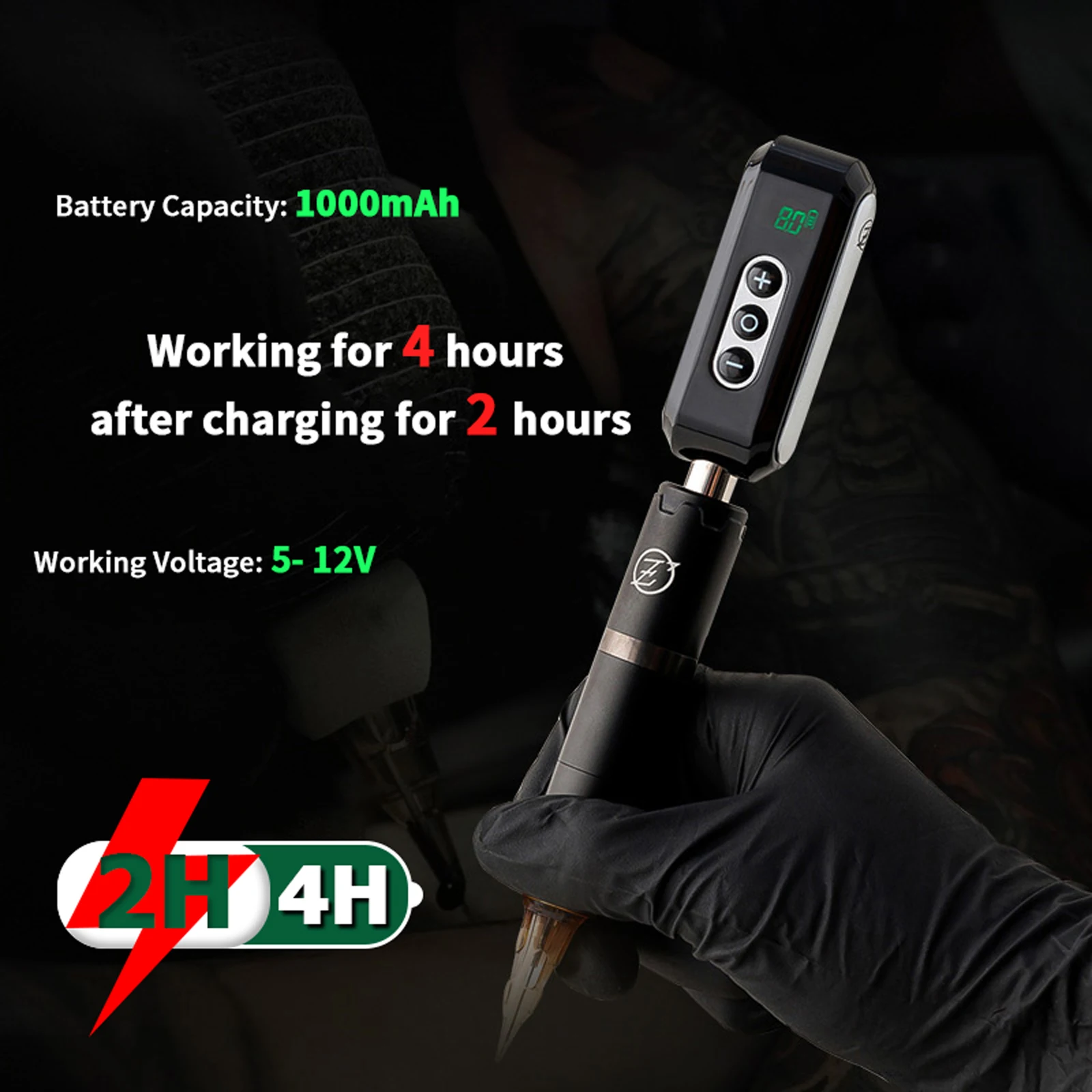 With the charging time of 2 hours, it can last up to 4 hours working time. depending on personal usage and the tattoo machine.