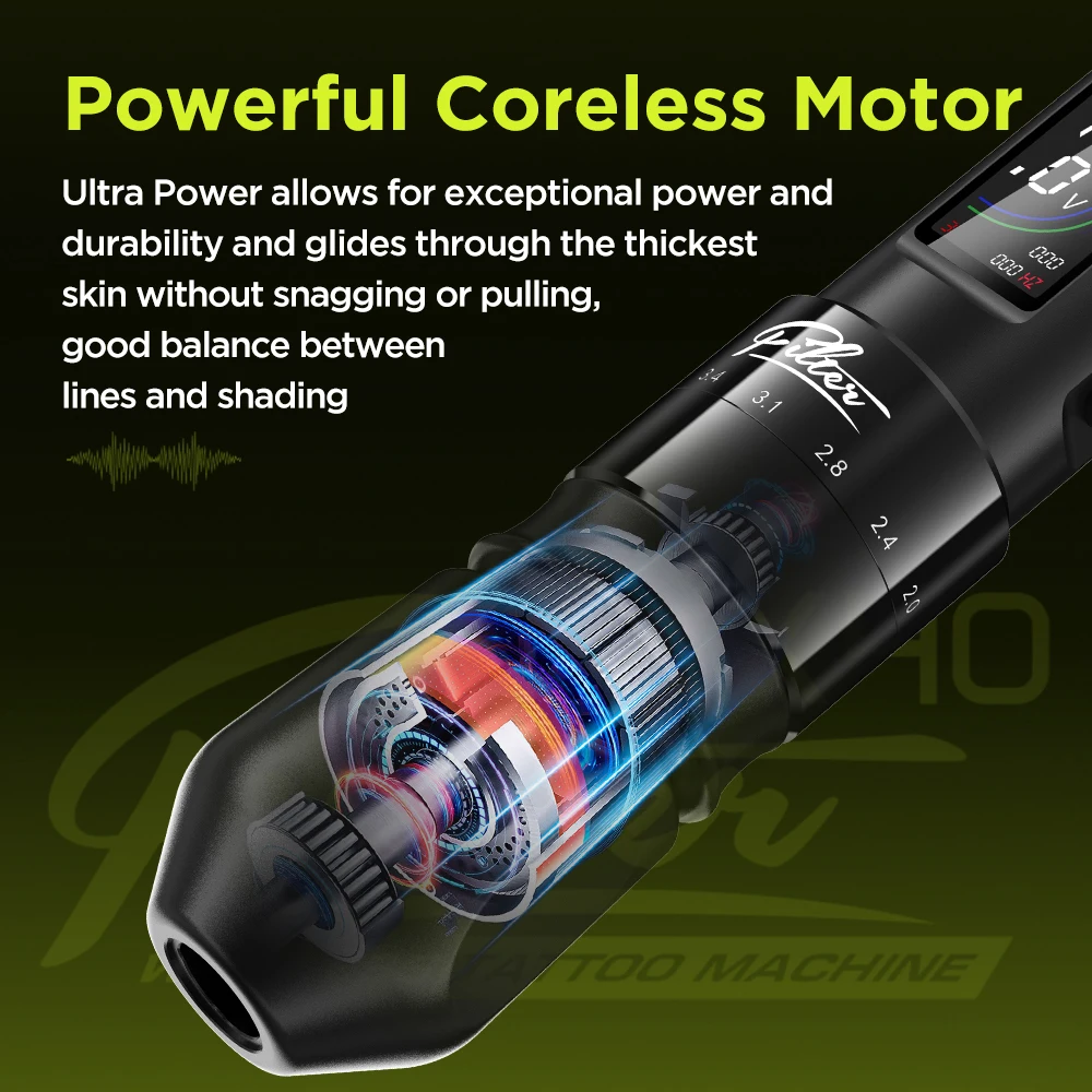 A pistola de tatuagem X40 possui um sistema de acionamento de última geração, garantindo uma operação suave, precisa e silenciosa; Ele transfere tinta suavemente para a pele, fornecendo tensão estável e baixo ruído para uma experiência excepcional para você e seus clientes.