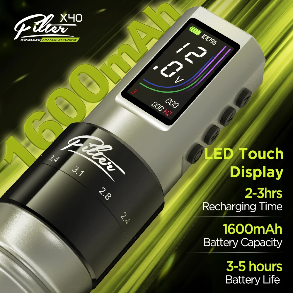 Filtro x40 sem fio máquina de tatuagem caneta 2.0-4.0mm cartucho ajustável pistola de tatuagem motor coreless 1600mah fonte de bateria sem fio