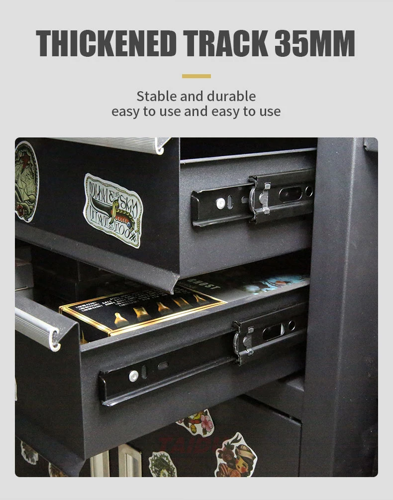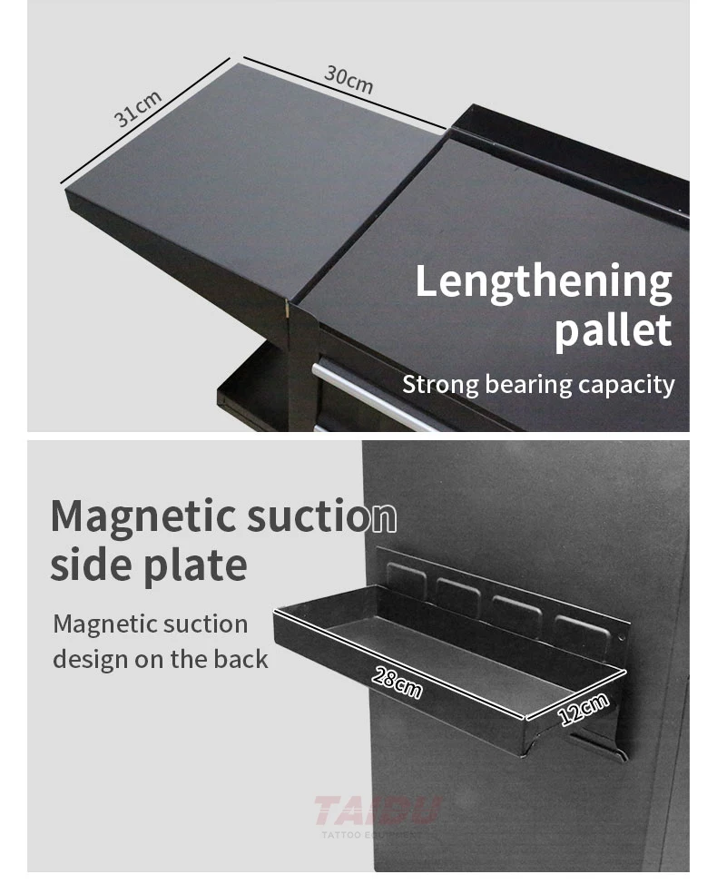 Outras características do produto: Uma placa de acrílico como tampo da bancada.Design de gavetas duplas.Alongamento da palete. Placa lateral de sucção magnética.Roda silenciosa universal dupla.