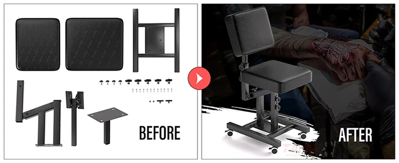 4.FÁCIL INSTALAÇÃO: O conjunto de cadeiras de tatuagem portátil inclui uma cadeira de tatuagem, um kit de ferramentas, nenhuma ferramenta é necessária para instalá-la, os acessórios estão todos na caixa, você pode instalar a cadeira de massagem de acordo com as instruções, leva apenas três minutos, venha e experimente a cadeira de massagem portátil para tatuagem!